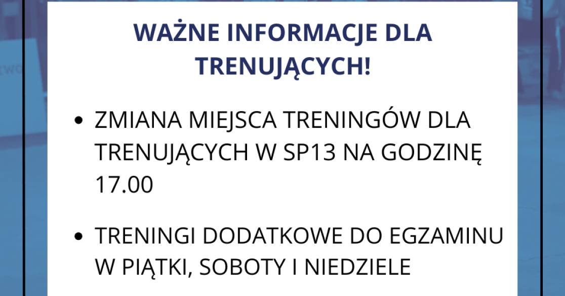 Grupa trenująca dotychczas o godz. 17:00 w SP13 od wtorku 3.02 zostaje przeniesiona do Dojo 2 (ul. Pana Tadeusza 6), godzina treningu bez zmian. Pozostałe grupy trenują nadal w SP13, ale jeśli ktoś chciałby zmienić miejsce treningu, może dołączyć do Dojo 2. Wszystkie treningi odbywają się w tych samych godzinach.