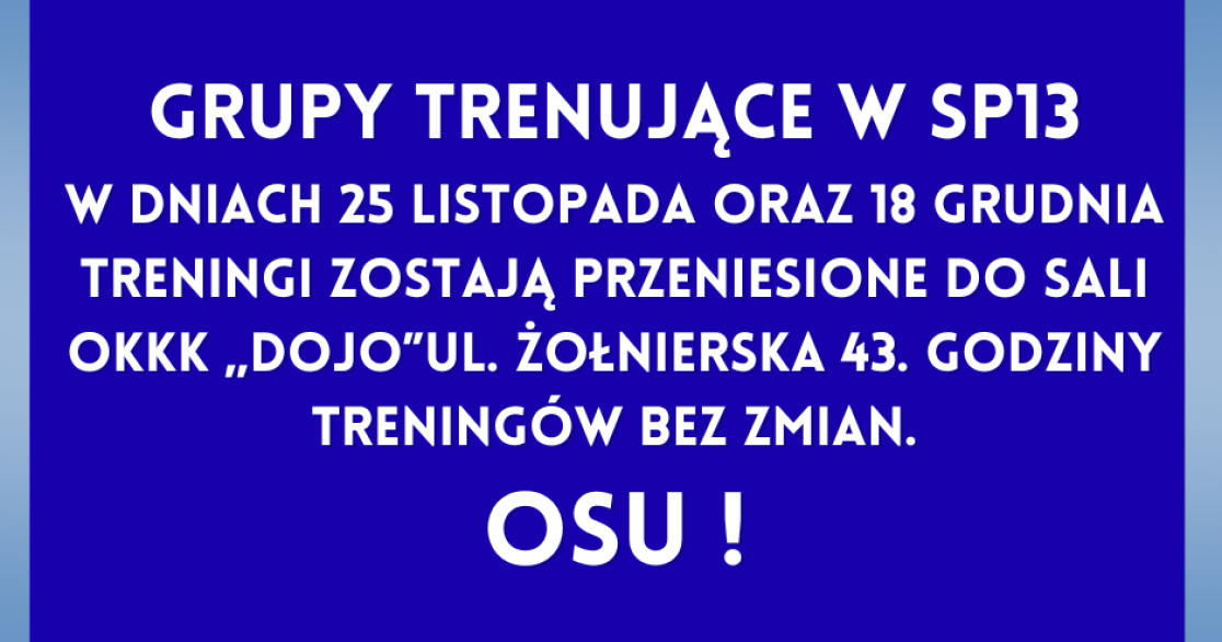 25 listopada (wtorek) oraz 18 grudnia (czwartek) treningi zostają przeniesione do Sali OKKK „Dojo”ul. Żołnierska 43.